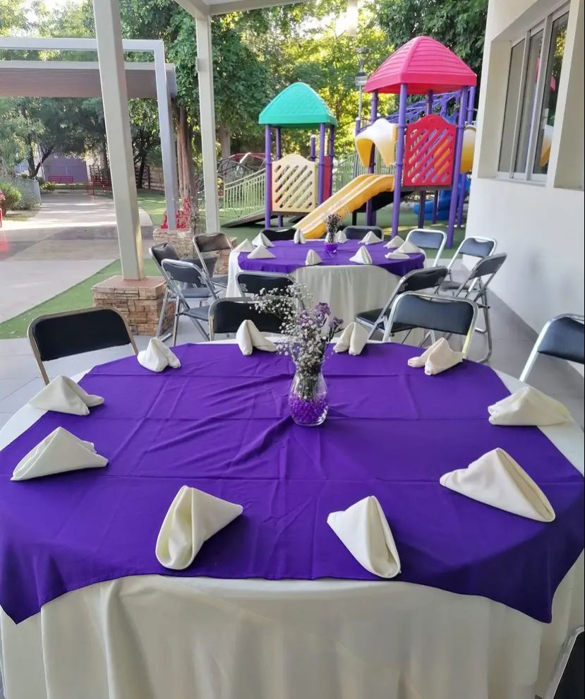 Ofrecemos mesas rectangulares, redondas y cuadradas; sillas metálicas y acojinadas; además de mantelería en diversos colores para que elijas lo que mejor se ajuste a tu estilo.